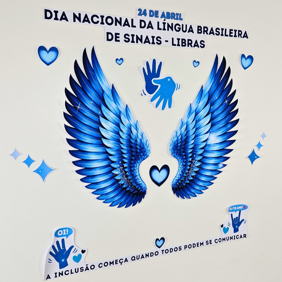 🔸Painel Asas com o tema Dia Nacional da Libras, comemorado em 24 de abril, celebrando inclusão, cultura surda, identidade e respeito.