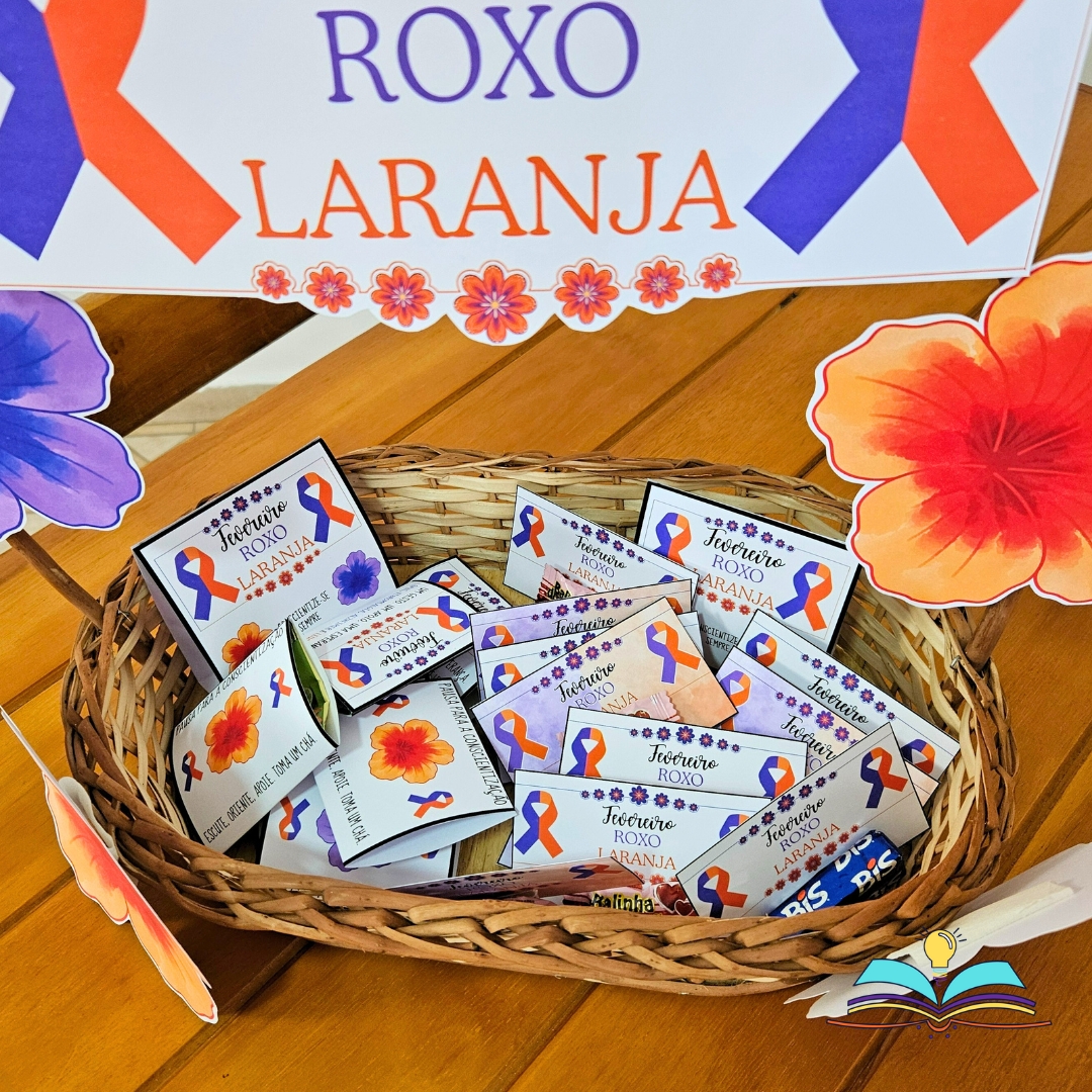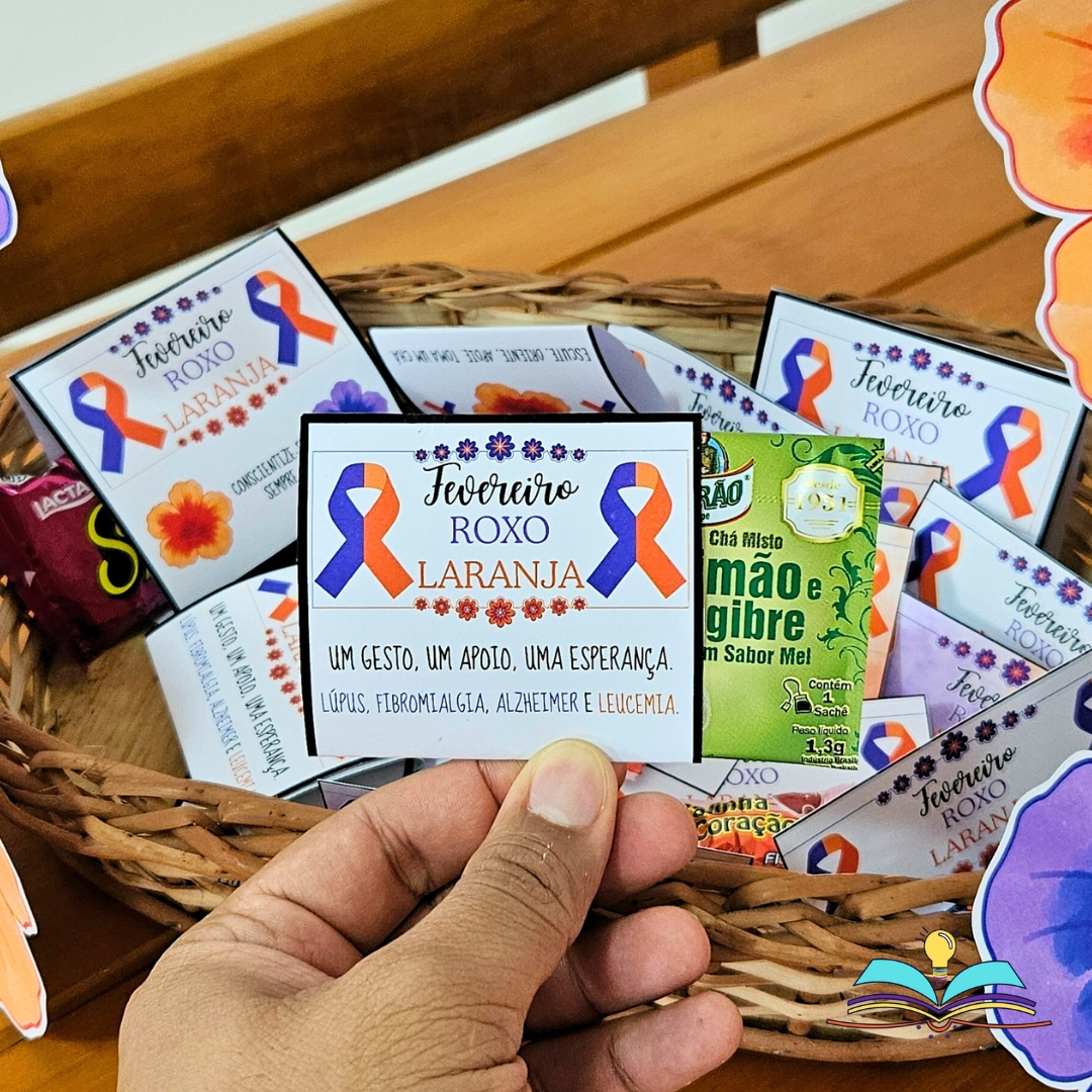 🔸Elementos decorativos para uma cesta com lembrancinhas do tema Fevereiro Roxo e laranja que tem como objetivo conscientizar a população sobre a importância da saúde
