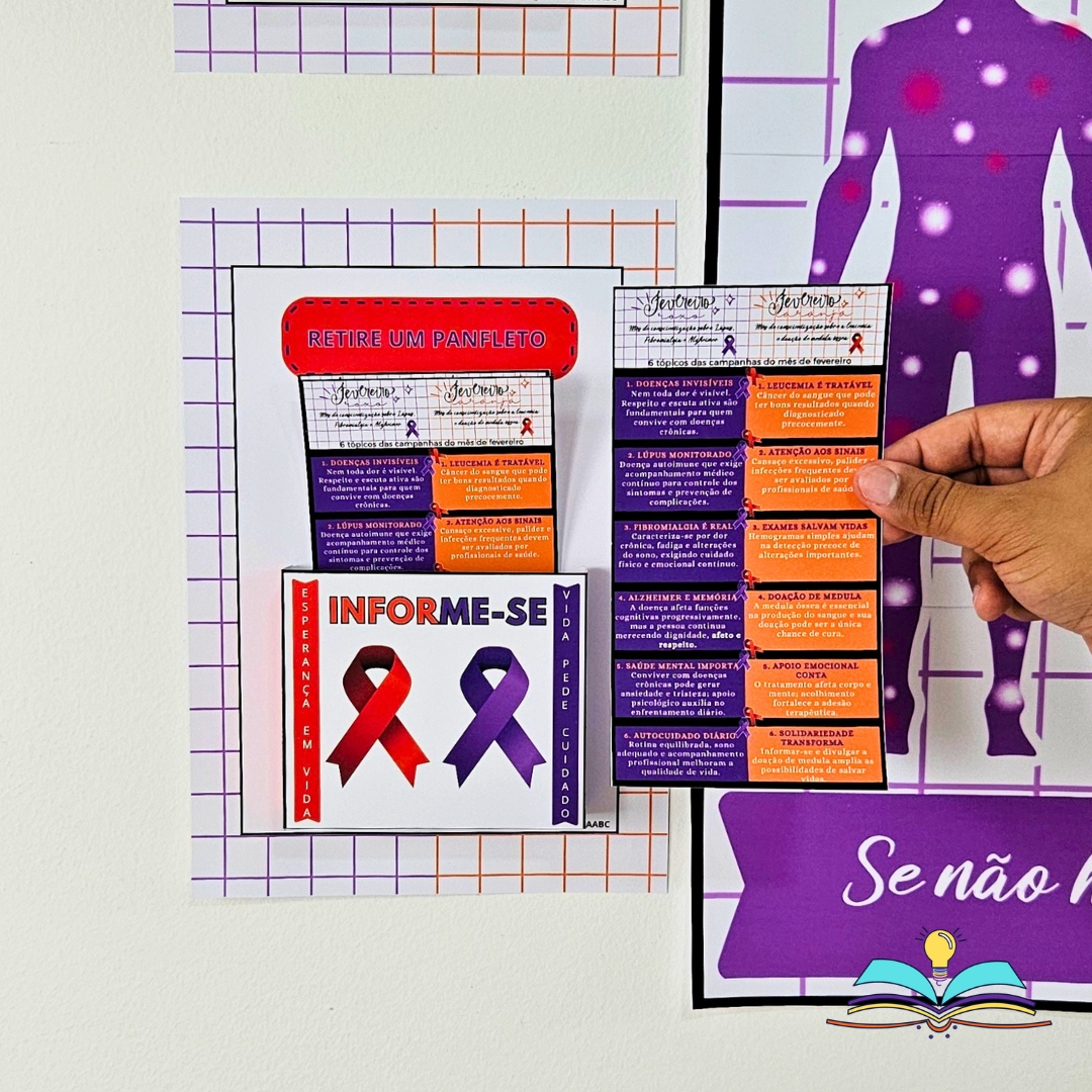 🔸Painel de conscientização a respeito das campanhas do Fevereiro Roxo (lúpus fibromialgia e Alzheimer) e Fevereiro Laranja (leucemia).