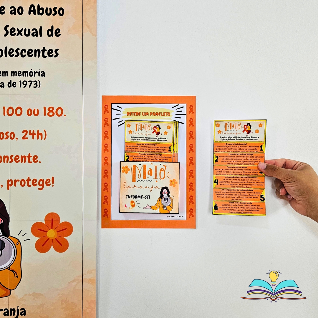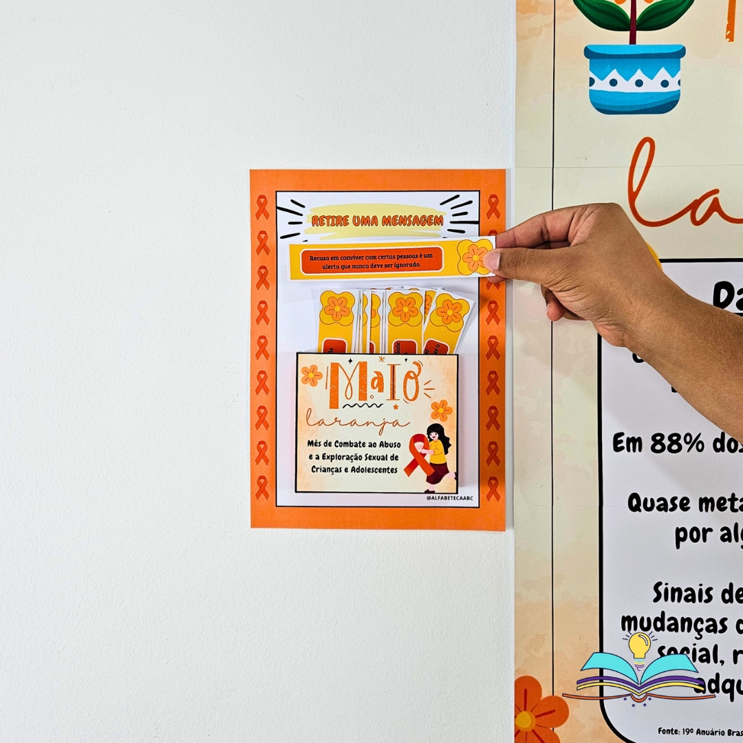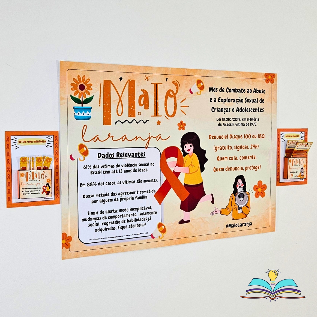 🔸Painel com o tema Maio Laranja, educativo para orientar, conscientizar e promover cuidado, atenção e proteção infantil.