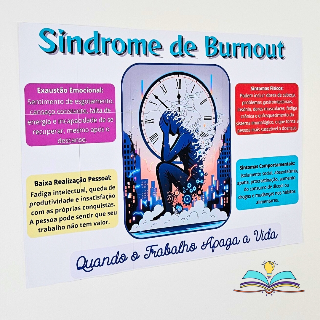🔸Painel com temática do Burnout (esgotamento profissional), que é uma síndrome de estresse crônico ligada ao trabalho, caracterizada por exaustão física e mental extrema, cinismo/despersonalização e sensação de ineficácia, resultando de sobrecarga, pressão e condições laborais desgastantes, afetando seriamente a saúde e exigindo atenção profissional.